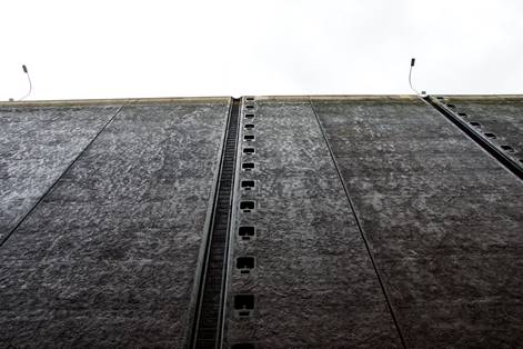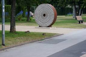 Ein verrosteter Stahlring mit Beton ausgegossen und symmetrischen Ornamenten als Spielplatz für wildlebende Kaninchen. Auf der anderen Uferseite Fische aus Stoff, die sich im Wind bewegen. Dieser Platz ist nicht erreichbar, da er zwischen einer Schleuse und dem Seitenarm