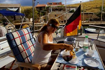 Am nächsten Morgen um ca 9.00 Uhr wurden wir durch Rufe – Fraanz, Fraanz- geweckt und unser Hafenmeister stand mit einem frischen Brot ,2 Kuchenräder und 2 Flaschen selbstgebrannten Pfirsichschnaps am Kai und lud uns zu einer Ausfahrt ein.