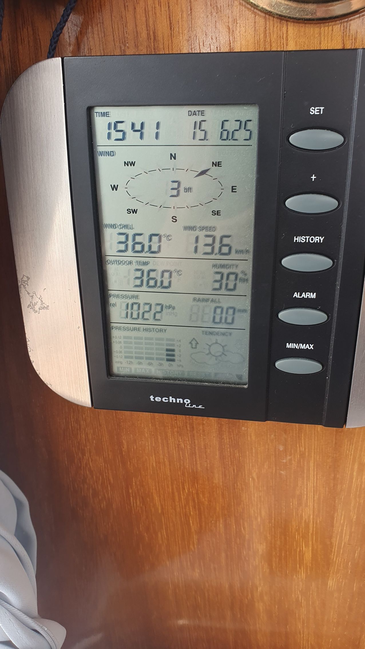 08.05.2025, Start zur Überfahrt nach Italien. Nach 9 Seemeilen (SM), wegen hohen Wellen ,4 Bft Wind in Böen 6 Bft, haben wir aufgegeben und sind zurück zu einem geschützten Ankerfeld. Wir hatten dort keinen Schwell in der Bucht und damit eine ruhige Nacht.