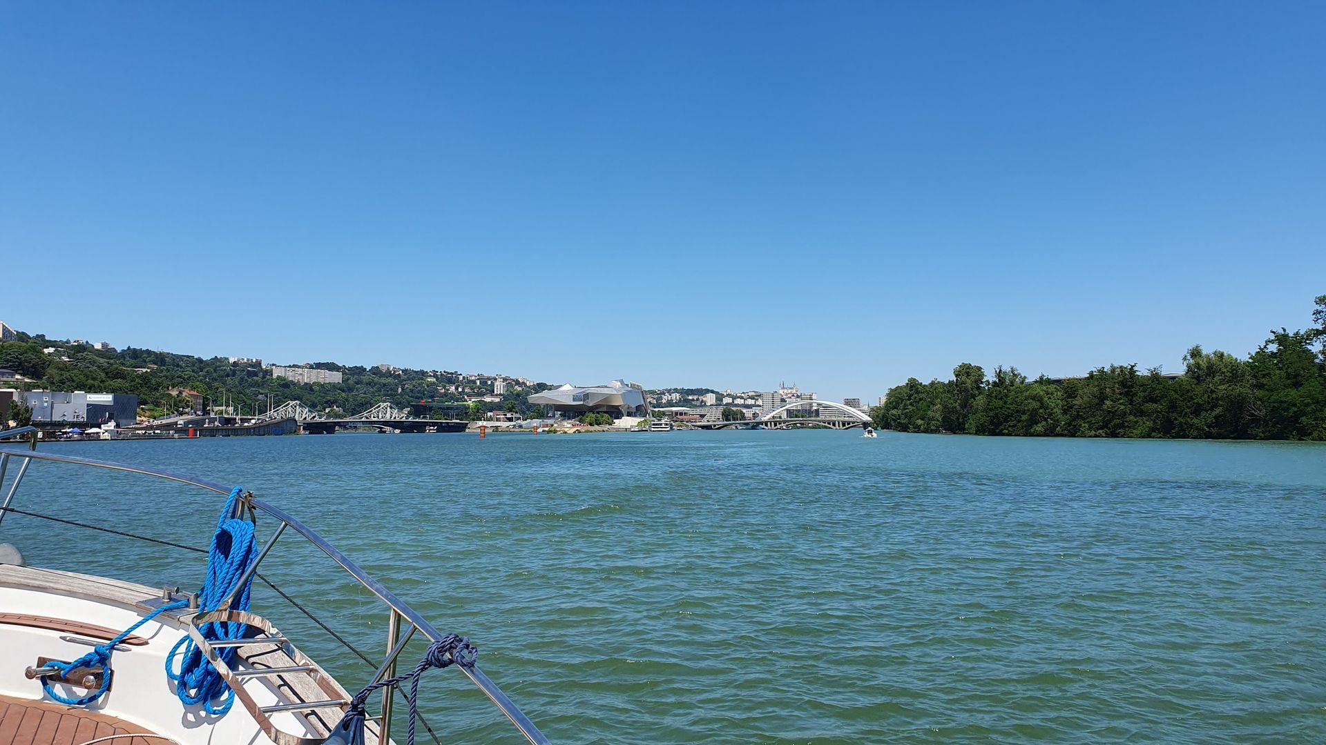 29.06.2025, Lyon. In der Ortsmitte gibt es einem engen, kleinen Hafen. Unsere Aufgabe war, unser Flaggenkreuz abzubauen und umzulegen, weil die Brücken in der Saone zu niedrig sind. Nachdem die Arbeit getan war, konnten wir das Treiben im Hafen vom Boot aus schön beobachten. Am Abend gab es ein kleines Gewitter mit einem starken Regenguss. Eine Erholung!!