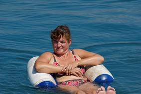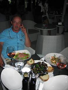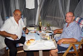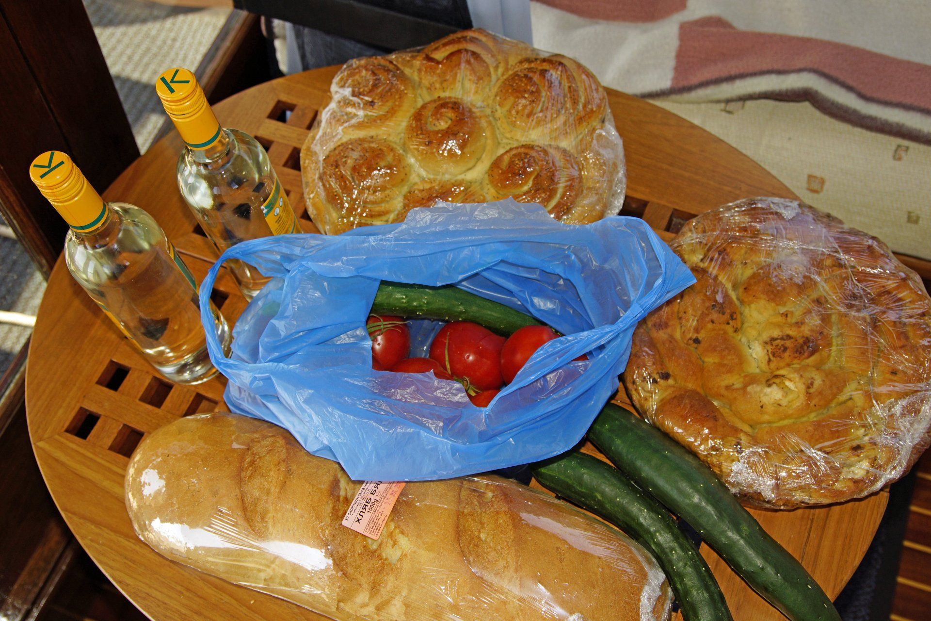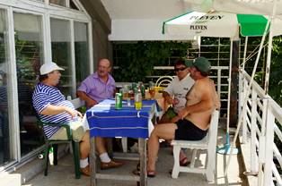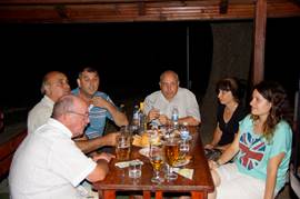 Unser Hafenmeister „Georgi“ teilte uns dann mit, dass wir zur Wasserschutzpolizei und zum Zoll müssten, um uns dort anzumelden. Die Entfernung dahin betrüge ungefähr ein Kilometer, aber er würde uns gerne dort mit seinem Pkw hinfahren. Gesagt getan. Er fuhr uns zu den beiden Behörden. Da er sie wohl alle kannte, wollten sie uns nicht mehr sehen. Nach dem wir zurück gefahren waren, wollte ich ihm 2,--€ für seine Bemühungen geben. Dies wies er ausdrücklich zurück und schenkte Ellen 2 Tomaten und 1 Glas selbsteingelegt Gurken. Außerdem bot er uns an, uns nach seinem Feierabend, in den Ort mitzunehmen. Was wir gerne annahmen, da sich der Ort in einem Kilometer Entfernung auf dem Berg befand, es immer noch 34 Grad warm war und wir in einem Restaurant essen wollten. Wegen seiner Hilfsbereitschaft gab ich ihm aus unserem Schiffsweinkeller eine gute Flasche Weißwein aus Krems (Österreich). Um 20.00 Uhr fuhren wir dann gemeinsam in den Ort. Aber nicht zu einem Restaurant, sondern in sein neu gebautes Wohnhaus. Nach Begrüßung seiner Frau, wurden von dieser, dann ca. 1 KG Tomaten und mehrere Gurken im Garten gepflückt und uns geschenkt. Weiterhin wurden wir in ein Restaurant eingeladen, wohin wir dann auch sofort gemeinsam fuhren. Dort gesellten sich im Laufe des Abends noch zwei weitere Freunde von ihm zu uns. Außerdem kam die erwachsene Tochter eines der Freunde noch zu uns, die sehr gut Englisch sprach. Bei mehreren Gläsern Bier, Wein und selbst gebrannten Pfirsichschnaps (50%) und einer ausgiebigen Mahlzeit verbrachten wir den Abend bis ca. 01.30 Uhr. Es war mir unmöglich die Rechnung zu übernehmen, da wir ja eingeladen waren.