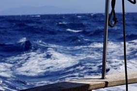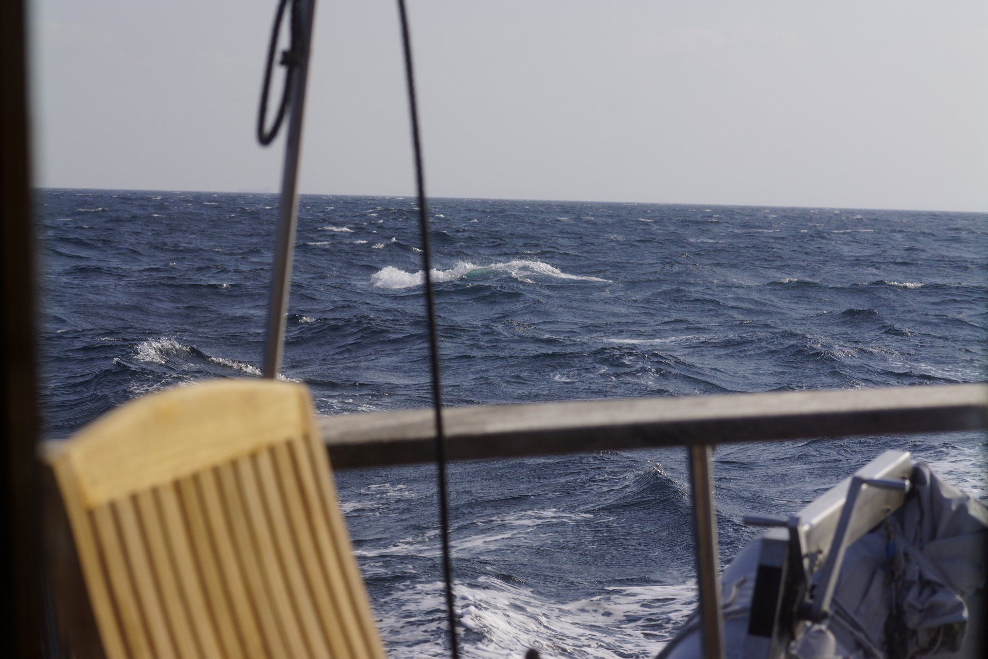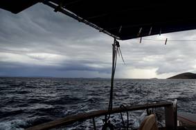 Den ganzen Tag hatten wir Rückenwind und Welle von hinten, aber irgendwie wird es immer schlimmer, leider kann man das auf Bilder nicht festhalten. Aber ständig Windstärke 5 in Böen 6 und einen Tag später nur noch Windstärke 6 kann einen ganz schlimm schaffen. Pauline hat einmal so auf der Seite gelegen, dass unser kleiner Elektroofen auf dem Brett abgestürzt ist. Was nicht fest war, hat sich schnell im Schiff verteilt. Die Stühle auf dem Achterdeck und auch der Tisch mussten umgelegt werden. Der ritt mit der Welle ging noch, obwohl ich manches Mal gedacht habe, die Welle klettert in das Schlauchboot hinten am Schiff rein. Höher als das Schlauchboot hängt, war sie auf alle Fälle. Teilweise sind wir auf den Wellen gesurft. Der Autopilot hat dann seine Arbeit eingestellt, weil das Schiff so auf der Welle hin und her geworfen wird, dass die Abweichung zum Steuern zu groß wurde. Dann musste ich selber steuern, was mir abends schmerzende Handgelenke eingebracht hat. Unten um Limnos herum, kam die Welle uns entgegen, ständig die Scheiben unter Wasser, Sicht nur zu erahnen.
