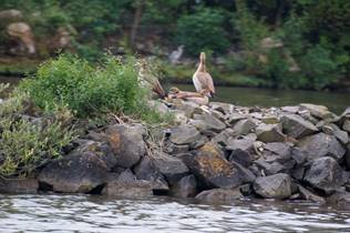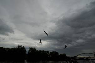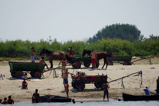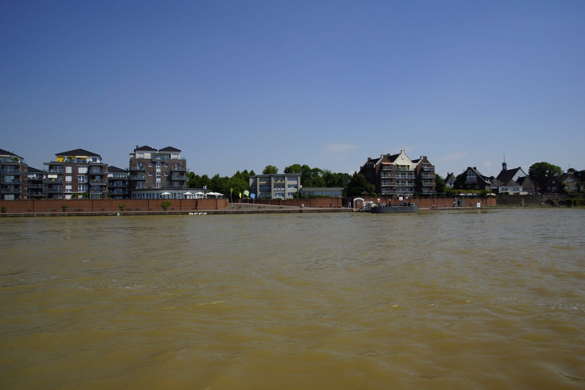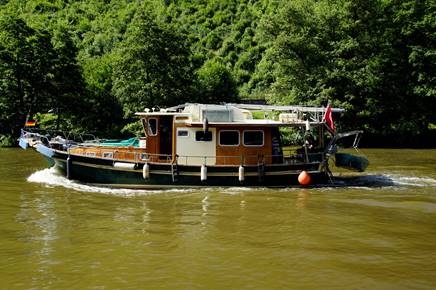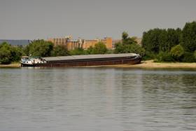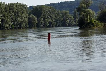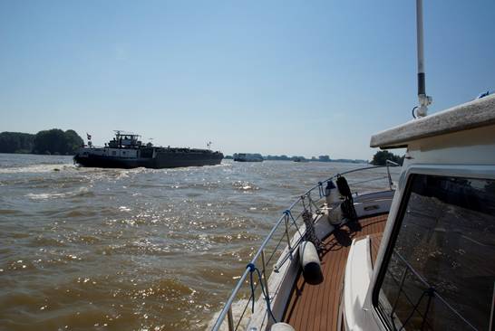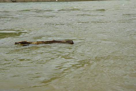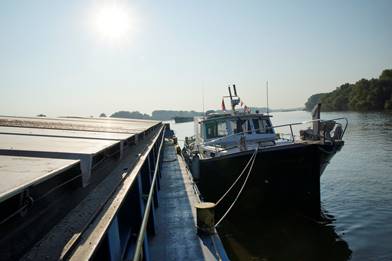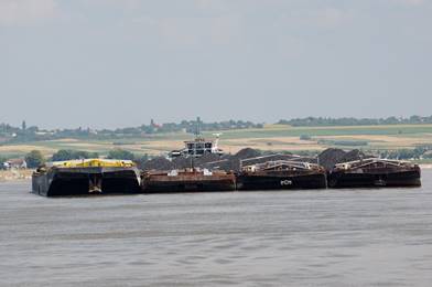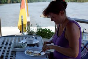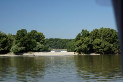 In der Mitte der Einfahrt lag ein Ruderboot quer, ich schimpfte noch. Kurz darauf wussten wir es, eine Sandbank lag direkt in der Einfahrt und wir sind draufgefahren. Schnell Maschinen Stopp und rückwärts. Pauline trieb schräg zum Strand, wo zum Überfluss auch noch viele Leute badeten. Ein ganz neugieriger Mann schwamm mit einem Kanu auf uns zu, die Motoren qualmten, wir schrien, er soll sich weg machen und dann kam Pauline wieder frei. Mit doch etwas Schreck in den Knochen fuhren wir weiter Richtung Stadt, um vielleicht ein Restaurant mit Anleger oder die Polizei zu finden. Ein Restaurant gab es nicht, der Anleger der Polizei war frei. Zwei nette junge Männer am Anleger sagten, wir können eine Nacht fest machen. Als alle 4 Befestigungen gelegt waren, kam eine Vorgesetzte dazu und wollte pro Stunde 40€ haben, die jungen Männer blickten verstohlen zu Boden, das war uns zu viel Geld. Es half nichts, alle Leinen wieder einholen und weiter. Laut unserem Donau Buch sollte es stromabwärts noch eine kleinen Yachthafen geben. Dabei fuhren wir an mehreren Leichtern, die im Strom ankerten, vorbei. Der Yachthafen war wieder zu klein für uns und es begann zu dämmern. Ich entschied mich, an einem Leichter zu übernachten, mir war nicht so ganz wohl dabei.