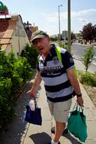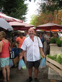 Bei der Bezahlung der Rechnung bin ich Georgi zuvorgekommen und habe bei der Kellnerin die Rechnung unter großen Protest von Georgi und seiner Frau beglichen. Für 3 Glas Bier (halber Liter), 1 Mineralwasser, 3 Suppen, 2 frittierten Käse, 2 Schweinefleischspieße, ein Geflügelspieß, gebackenen Fladenbrot und einmal Creme-Brülee habe ich 16,--€ bezahlen müssen. Auf dem Weg zurück zum Schiff kaufte Georgi noch eine Honigmelone und eine Wassermelone die er uns natürlich auch noch schenkte. Außerdem besuchte er mit uns noch ein wunderschönes Hotel, wo er einen Freund begrüßte, der uns anschließen noch eine Tüte mit Weintrauben schenkte. Eine Möglichkeit die Getränkerechnung im Hotel zu bezahlen hatte ich nicht!!