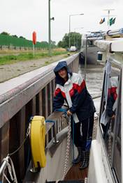 Dieses Vorhaben wäre uns schwer möglich gewesen, da der Schleusenwärter nur Rumänisch spricht, uns aber zu einem Verband mit anderen Schiffen zusammenstellen muss und am Ende des Kanals in Konstanza, nur in rumänischer Währung bezahlt werden kann. Auch hier wieder viel Glück und Gastfreundschaft .Wir legten an ein Lotsenschiff an und baten um Übernachtungsmöglichkeit. Der Kapitän sprach recht gut Deutsch und klärte uns über die Gepflogenheiten bei der Schleuse auf. Anschließend übernahm er den Funkverkehr mit der Schleuse und fuhr uns noch mit seinem Privat-Pkw in dem Ort zu einer Bank, damit wir rumänische Lei abheben konnten. Auch hier selbstlose Hilfe von rumänischen Menschen.