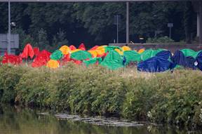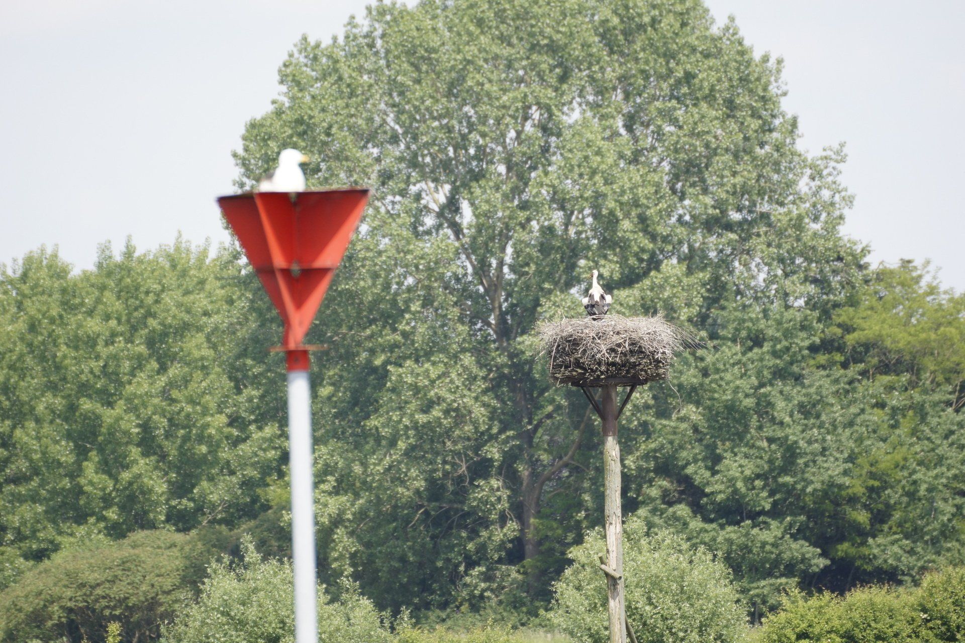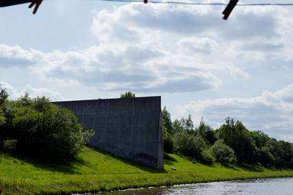 Ein verrosteter Stahlring mit Beton ausgegossen und symmetrischen Ornamenten als Spielplatz für wildlebende Kaninchen. Auf der anderen Uferseite Fische aus Stoff, die sich im Wind bewegen. Dieser Platz ist nicht erreichbar, da er zwischen einer Schleuse und dem Seitenarm