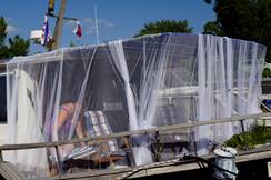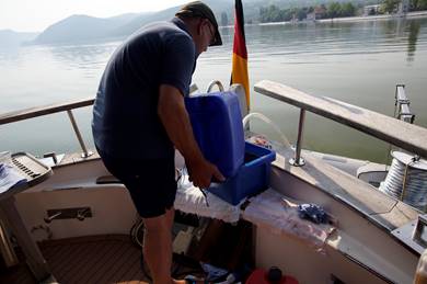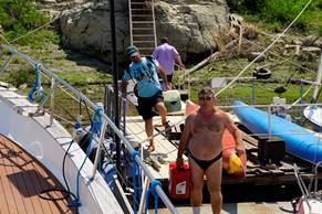 Heute hieß es das erste Mal aus Kanister zu tanken, weil am Ufer die Straßentankstelle gut zu erreichen ist. 160 Liter aus den Kanistern in die blaue Wanne, mit Hilfe einer Bilgenpumpe in den Tank, das Schlauchboot klar machen, 6 Kanister hinein und ab übers Wasser. Der kleine Hafen war voller Seegras, der sich um die Schraube wickelte und uns stehen blieben lies. Mit den Paddeln weiter zum Ufer, Kanister füllen, etwa 400m schleppen, Seegras von der Schraube entfernen, über das Gras paddeln bis zur Hafeneinfahrt, Motor an und zum Boot, was vor Anker liegt. Jetzt das Gleiche noch einmal.
