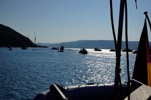 Limnos, wir ankern im Hafenbecken, weil kein Platz am Kai frei ist. Das Schlauchboot wird klargemacht, wir wollen in Griechenland einklarieren. Was heißt einklarieren? Jedes Schiff, das von See kommend ein Land anläuft, muss den nächsten Hafen, welcher ein Port of Entry ist, ansteuern und dort einklarieren. Diese gilt auch für Schengen Staaten. Das heißt man muss den Hafenmeister, die Border Polizei oder die Coast Guard und den Zoll aufsuchen und unter teilweise großen Aufwand den Papierkram erledigen. Man bekommt dann ein Transitlog für die weiteren Häfen des Landes. Bei der Überfahrt zur Hafenbehörde müssen wir gegen die Welle und werden natürlich richtig nass, tolles Bild vor den Behörden. Freitagnachmittag halb Fünf, am Hafenamt angekommen, werden Papiere mal wieder ausgefüllt und dann wird uns gesagt, dass wir nicht vollständig einchecken können, es ist erst am Montag wieder derjenige in dem Büro. Wir können weiterfahren und dann in Lavrion am Festland einchecken. Da der Wind ständig bläst und der Wetterbericht auch nichts Gutes sagt, entschließen wir uns einen Tag abzuwarten und erst am Montag weiterzufahren. Gute Wahl, nach dem langen Ritt einen Tag zuvor (über 80sm), tat das Ausruhen sehr gut. Es liegen auch noch lange Etappen vor uns.