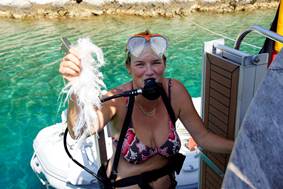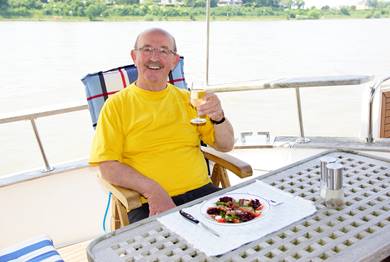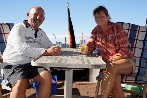 Am nächsten Morgen um ca 9.00 Uhr wurden wir durch Rufe – Fraanz, Fraanz- geweckt und unser Hafenmeister stand mit einem frischen Brot ,2 Kuchenräder und 2 Flaschen selbstgebrannten Pfirsichschnaps am Kai und lud uns zu einer Ausfahrt ein.