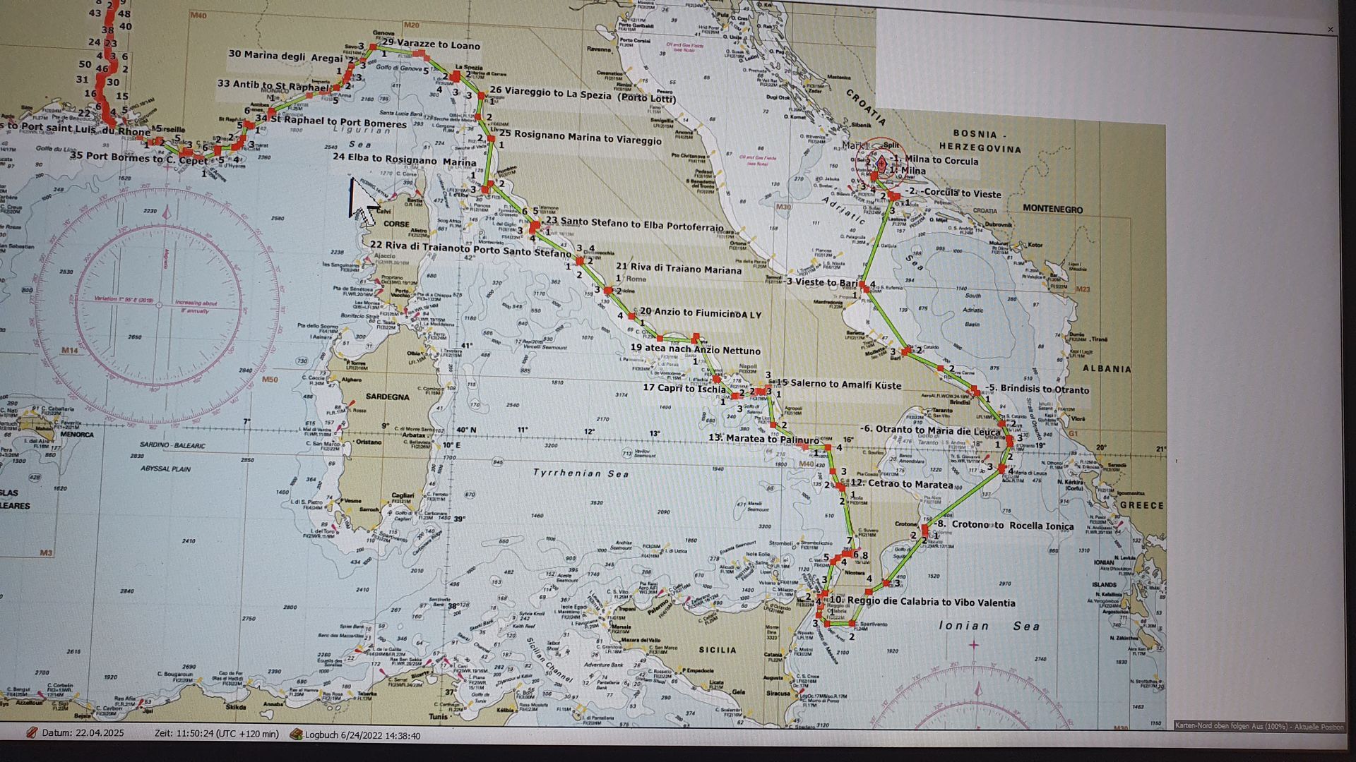 21.05.2025, Eine ruhige Überfahrt von Scilla nach Vibo Valentia. Dort im Hafen angelegt und reichlich Proviant gebunkert. Die Überfahrt war ohne Probleme, nur am Nachmittag gab es wieder hohe Wellen.