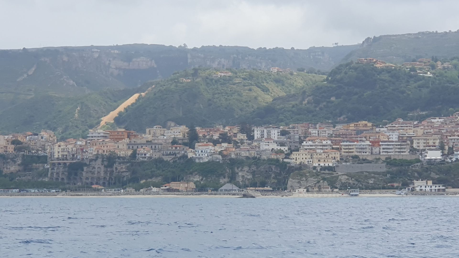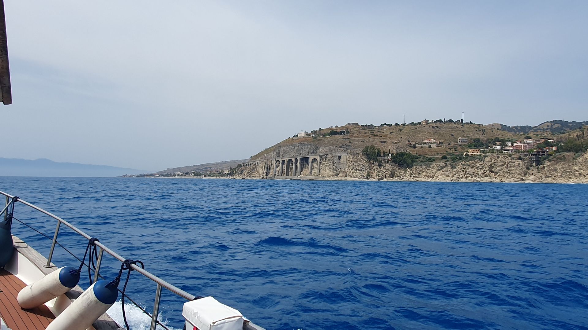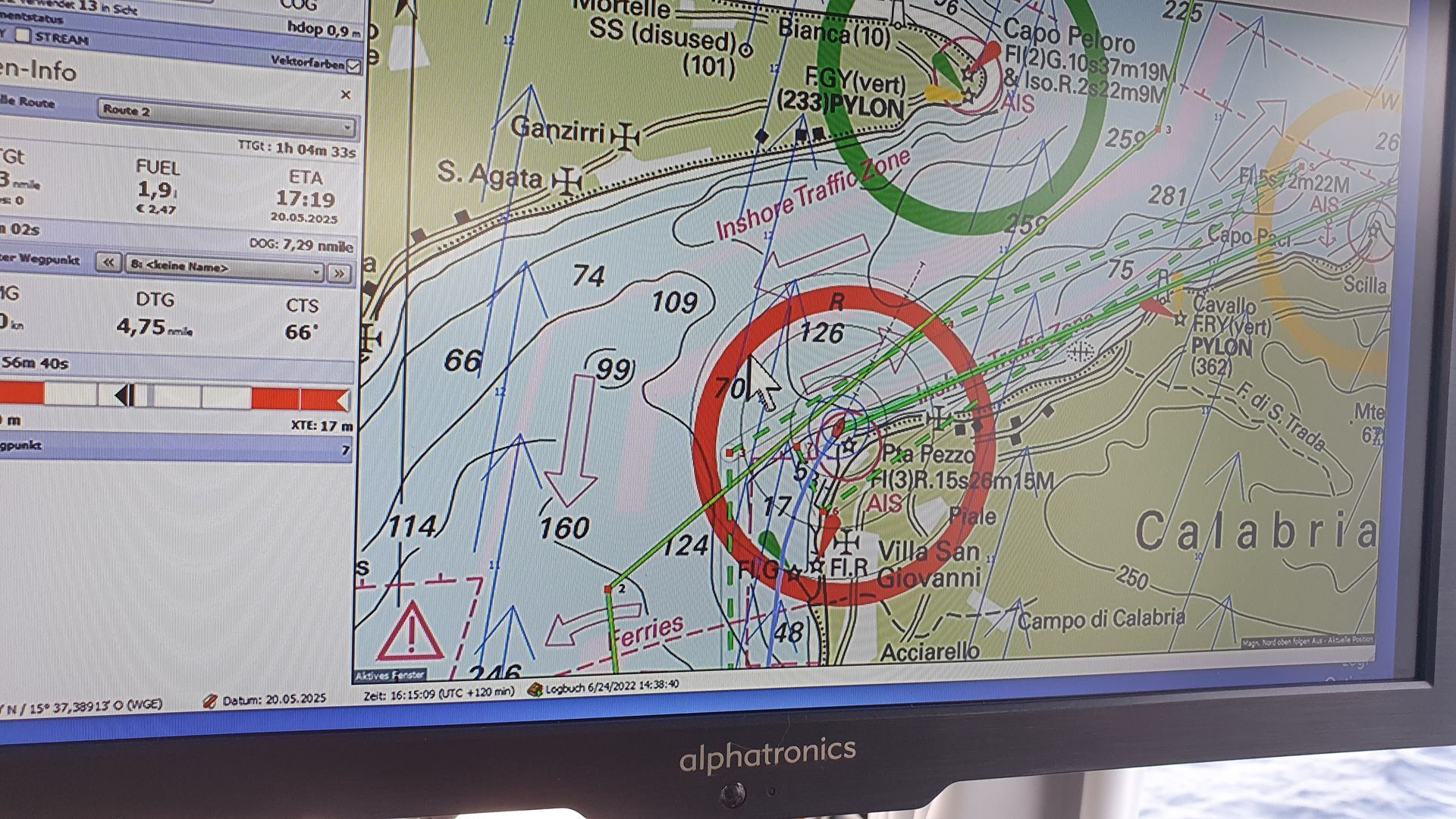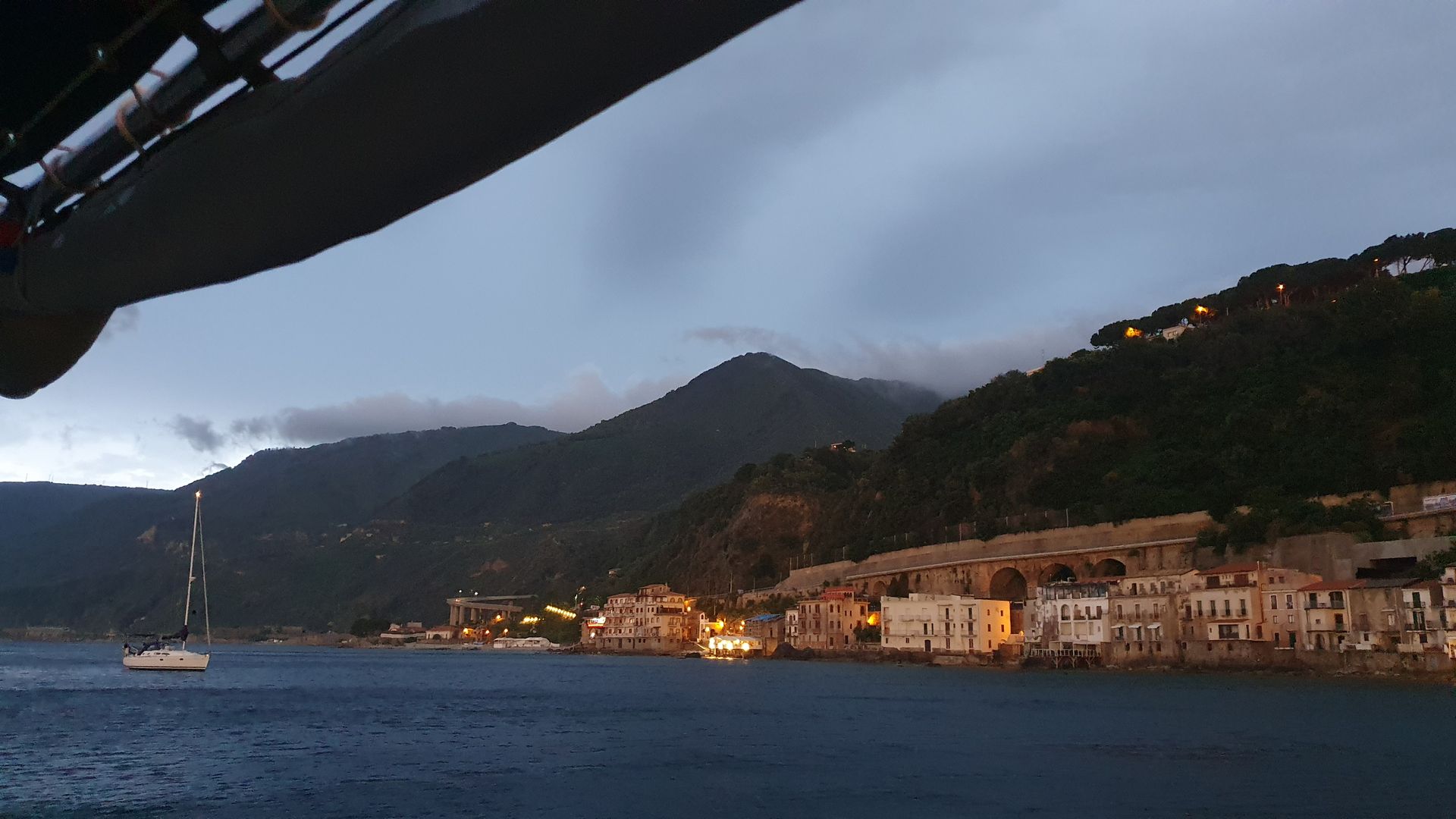 20.05.2025, 7:30 Uhr Abfahrt nach Reggio di Calabria, der Hafen vor der Durchfahrt,der Straße von Messina liegt. Wir mussten allerdings dann erfahren, dass der Hafen Gebühren in Höhe von 150,--€ verlangt und das für einen Hafen, der keinerlei Komfort bietet und recht weit zu den Einkaufsmöglichkeiten liegt. Also Sizilien links liegen gelassen und Weiterfahrt durch die Straße von Messina, zur Ankerbucht von Scilla. In der Straße von Messina gibt es eine Strömung von 4 Knoten, die von vorne kommt, so dass wir nur noch mit 5,5 Knoten voran kamen, bei 2000 Umdrehungen des Motors. Normal fahren wir dann 8,0 bis 9 Knoten. Aber wir hatten Rückenwind und es ging gut vorwärts. Die Kulisse von Scilla war sehr schön. In der Nacht gab es ein Gewitter mit Fall Böen von 6-7 Bft und strömenden Regen. Eine französische Yacht wurde Richtung See abgetrieben, bevor wir helfen konnten, wurde die Crew allerdings wach und hatte die Sache im Griff. Unser Anker hat gehalten und als das Gewitter vorbei war, hatten wir noch eine ruhige Nacht.