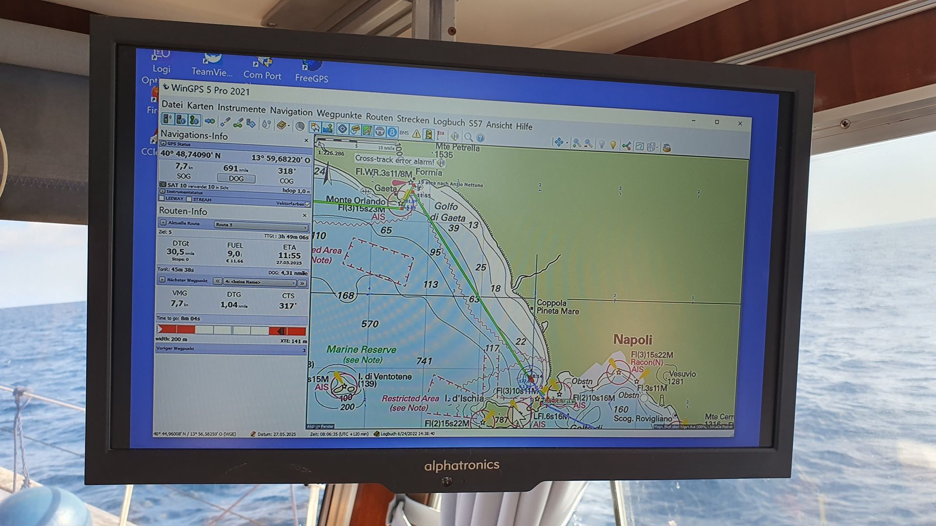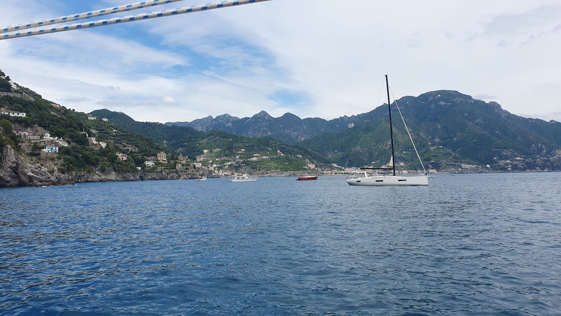 24.05.2025, Eine Fahrt zu einem Highlight unserer Reise, der Amalfiküste. Am Anfang ruhige See, zum Schluss wieder viel Wind und hohe Wellen. Der Platz vor der Amalfi-Stadt, wo wir ankern wollten, war von Booten belegt. Tausende Touristen standen an, um mit Ausflugsbooten zu den Blauen Grotten zu kommen. Ca. 1 Sm vom Ort konnten wir dann ankern. Es war mehr als unruhig, durch die vielen Ausflugsboote und Fähren wurden wir hin und her geschleudert, so dass man Angst hatte in Seenot zu geraten. In der Nacht gab es zwar Fall Böen von 5 Bft, trotzdem konnten wir gut schlafen.