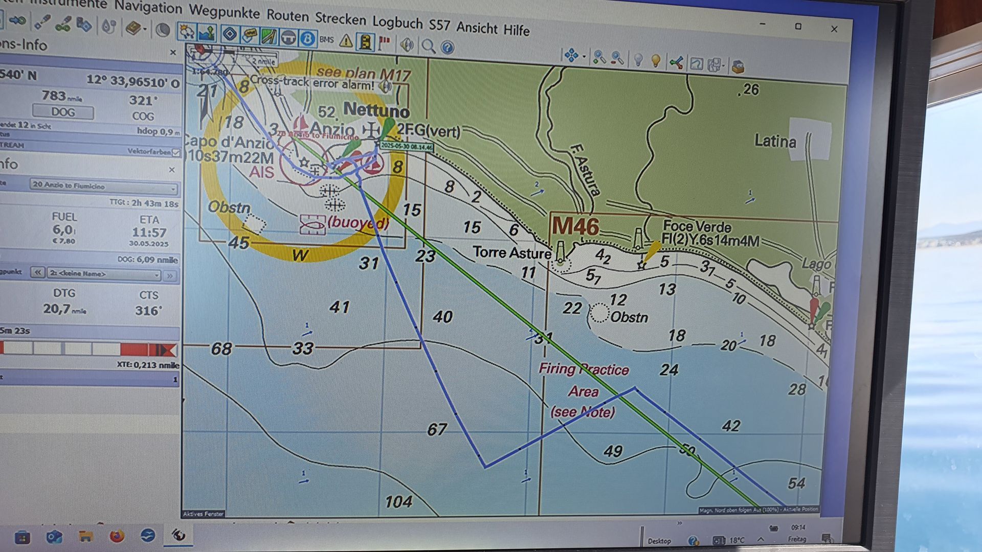 29.05.2025, Es geht weiter Richtung Anzio. Wellen von West sind heute unser Begleiter mit mäßiger Höhe. Nach ca. 10 SM kommt plötzlich ein Schlauchboot, mit 2 roten Fahnen und teilt uns mit, dass wir in Richtung eines Schießgebiets der Marine fahren. Der Mann forderte uns auf, über Funk den Kanal 8 abzuhören. Wir wurden daraufhin aufgefordert ca. 5 Seemeilen Richtung West zu fahren und weiteren Anordnungen abzuwarten. Ich muss sagen, alles in einem sehr höflichen Ton. Nach den 5 Seemeilen wurde uns mitgeteilt, dass wir nun den Kurs auf Anzio nehmen könnten. Also wieder direkten Kurs auf Anzio. Leider war der Hafen in Anzio voll belegt, so dass wir nach der Marina Nettuno ausweichen mussten. Eine Marina mit 970 Liegeplätzen. Hier konnten wir anlgen. Auf Wunsch kann man vom Liegeplatz zur Hafenverwaltung per Golfwagen abgeholt werden. Eine Marina zum Wohlfühlen, nein! Einfach viel zu groß. Nach einem Gewitter mit 7 Bft Wind, schwamm plötzlich ein großer alter Rettungsring auf Pauline zu. Als er Pauline berührte, war er unser und Ellen hat ihn an Bord geholt. Wie sollte man nun klären, wer von den über 900 Schiffen in wohl verloren hat.