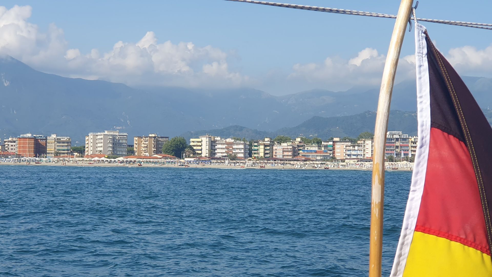 06.06.2025, Neues Ziel Viareggio. Gutes Wetter, glatte See und um 10:00 Uhr ,Temperaturen vom 26 Grad. In Livorno, wo wir längs fahren, liegt das Kreuzfahrtschiff „ Norwegian Breakaway“ vor Anker. Weit von der Marina Viareggio mussten wir ca. 600 Meter vor der Küste ankern. Ein schauriges Gefühl und es war auch eine schauklige Nacht. Auch hier wieder große Strände mit Liegen und Sonnenschirmen.