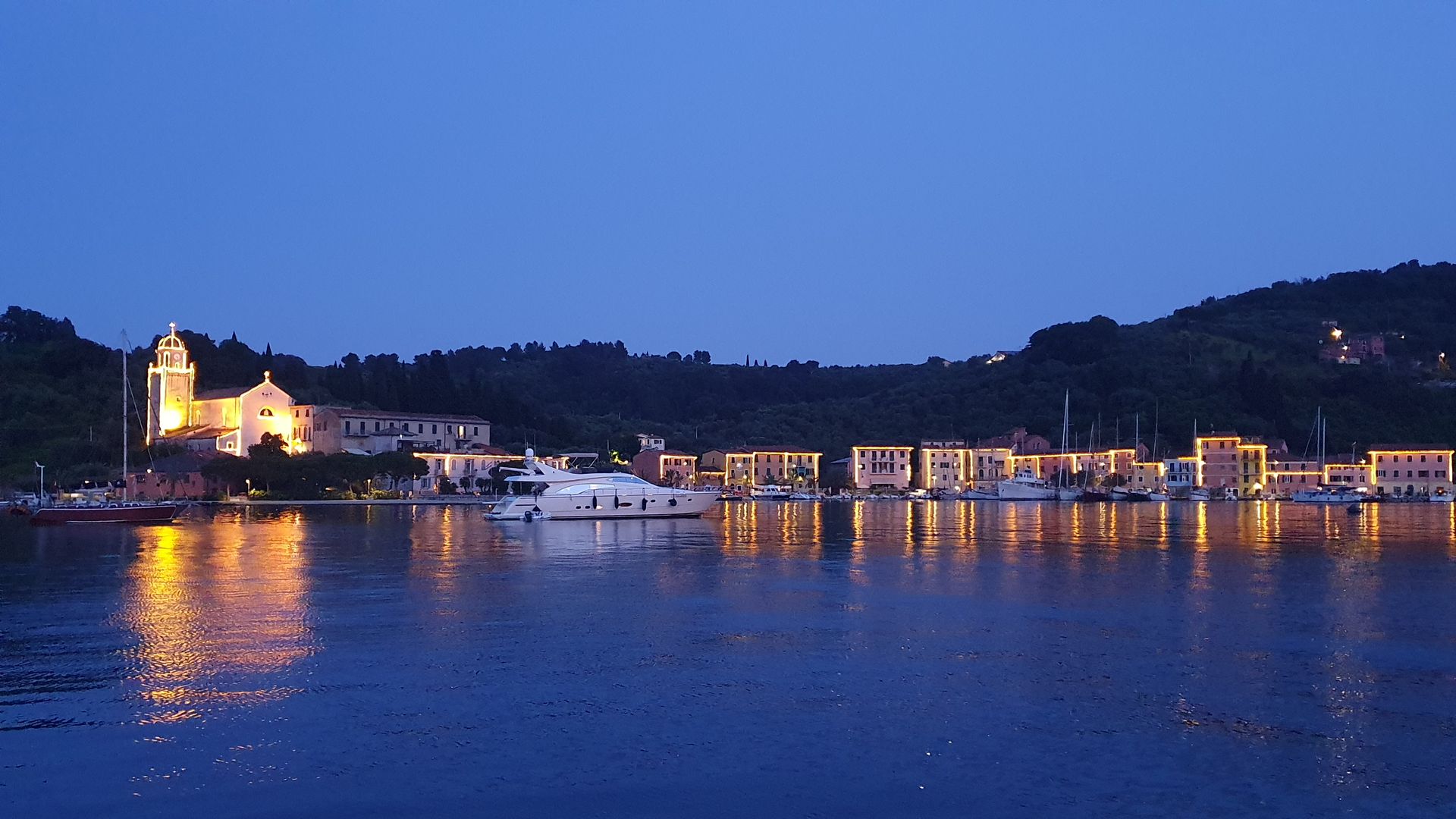 08.06.2025, Da die Wettervorhersagen schlecht waren, haben wir beschlossen, meinen Geburtstag hier zu feiern. Obwohl Pfingstsonntag ist, sind wir mit dem Schlauchboot zum Einkaufen gefahren. Abends ging es dann zum Feiern in das hervorragende Restaurant, im Hotel „Bella Baia“. In der Zeit, als wir in der Bucht lagen, konnten wir beobachten, dass ein Kreuzfahrtschiff, 2 große Containerschiffe und ein Flugzeugträger die Bucht La Spezia verlassen haben.