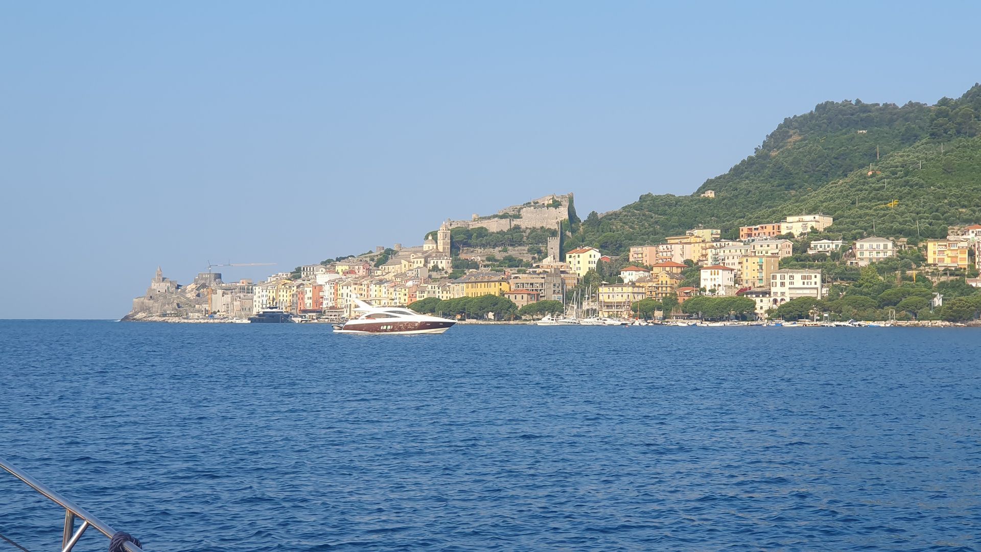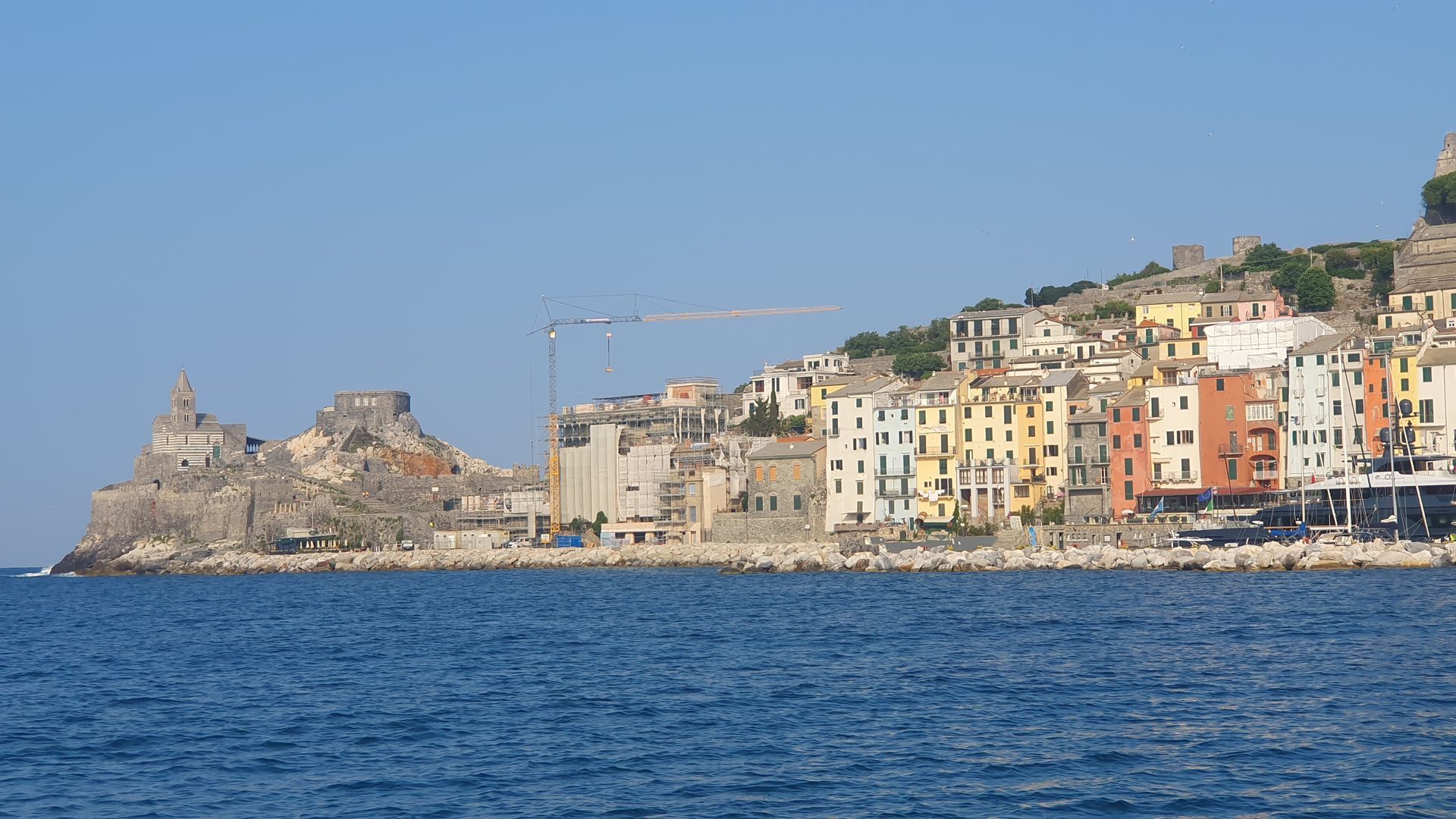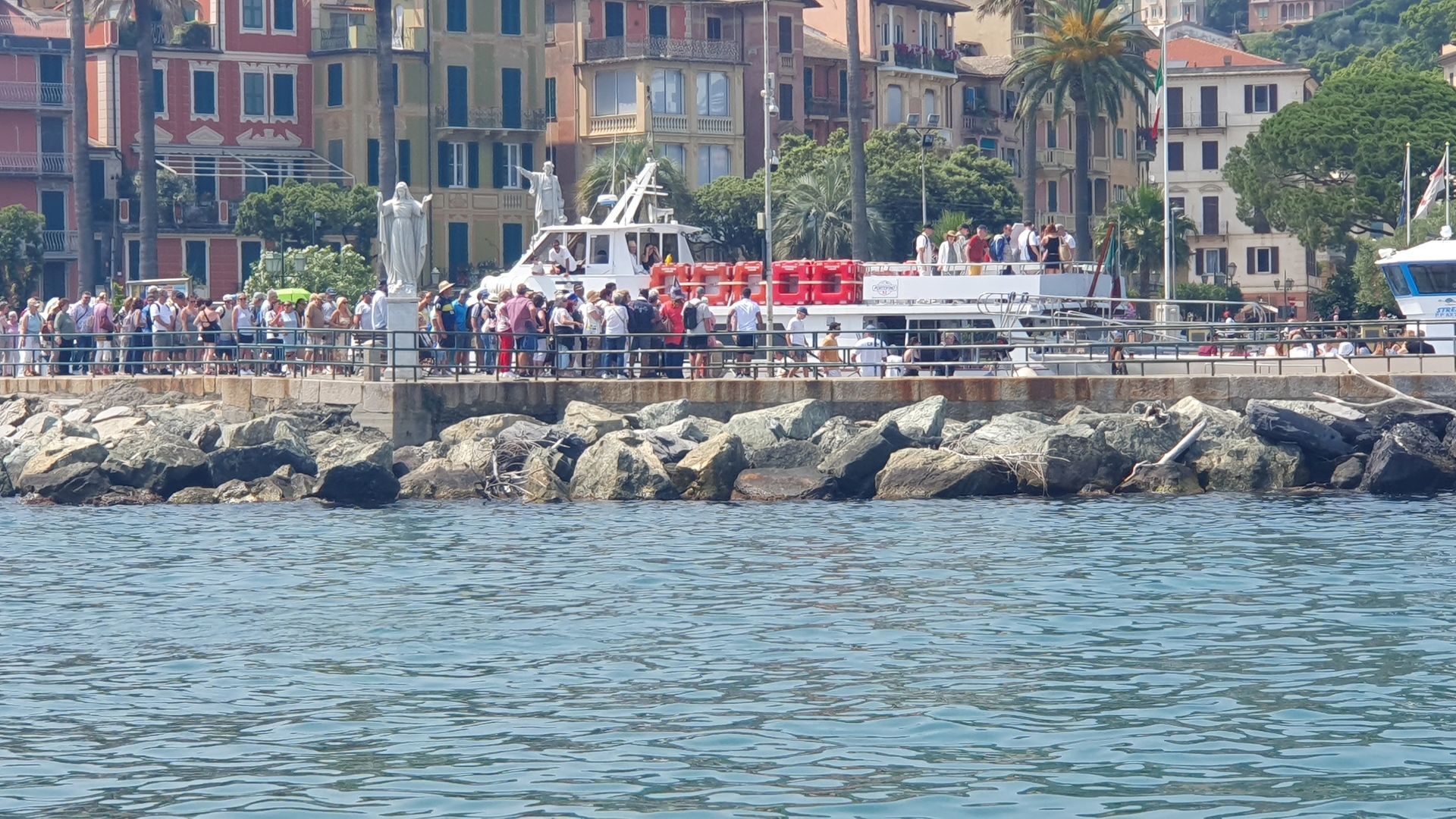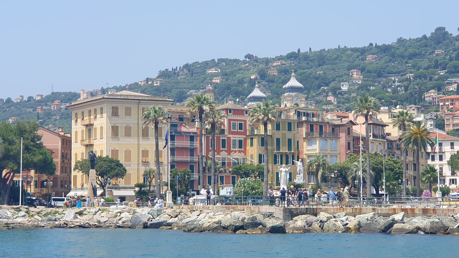 09.06.2025, Wie immer geht es 7:30 Uhr los. Der starke Wind war weg und wir dachten, es würde eine schöne Überfahrt. Aber es kam anders. Wir mussten zwischen dem Festland und der Insel Palmaria durch. Hier hatten sich sehr hohe Wellen noch vom Vortag aufgebaut und es wurde eine heftige Berg- und Talbahnfahrt. Zum Ende der Fahrt wurde es wieder ruhiger und unser Ziel war ein Ankerplatz vor der Marina Portefino. Leider lag hier ein Kreuzfahrtschiff vor Anker so dass ein reger Betrieb zwischen Kreuzfahrschiff und dem Hafen bestand. An Ankern war nicht zu denken. Also weiter zur nächsten Ankerbucht. Auch hier keine Möglichkeit, da dort eine große Superyacht die Bucht in Beschlag nahm. Also Weiterfahrt nach Santa Mageritha. Der Ort sieht vom Wasser sehr, sehr hübsch aus. Dort im Hafenbecken, Anker runter und alles war gut. Hier herrschte ein großer Andrang zu den Ausflugschiffen. Leider kamen wir einem Ausflugschiff, das später in der Nähe an eine Muring anlegte, immer näher. Also Anker hoch und eine neue Stelle suchen. Den haben wir dann auch gefunden und eine ruhige Nacht verbracht.