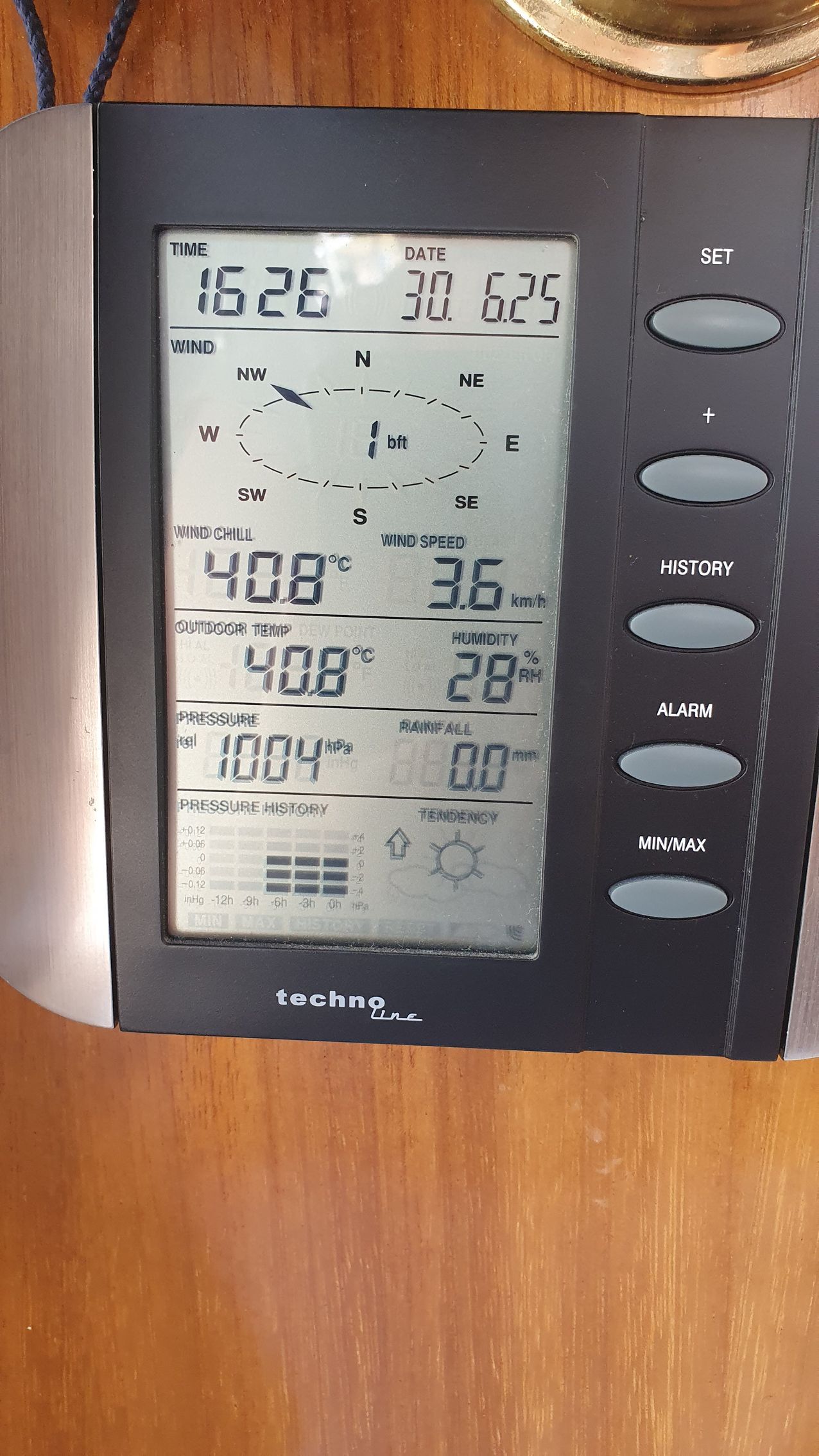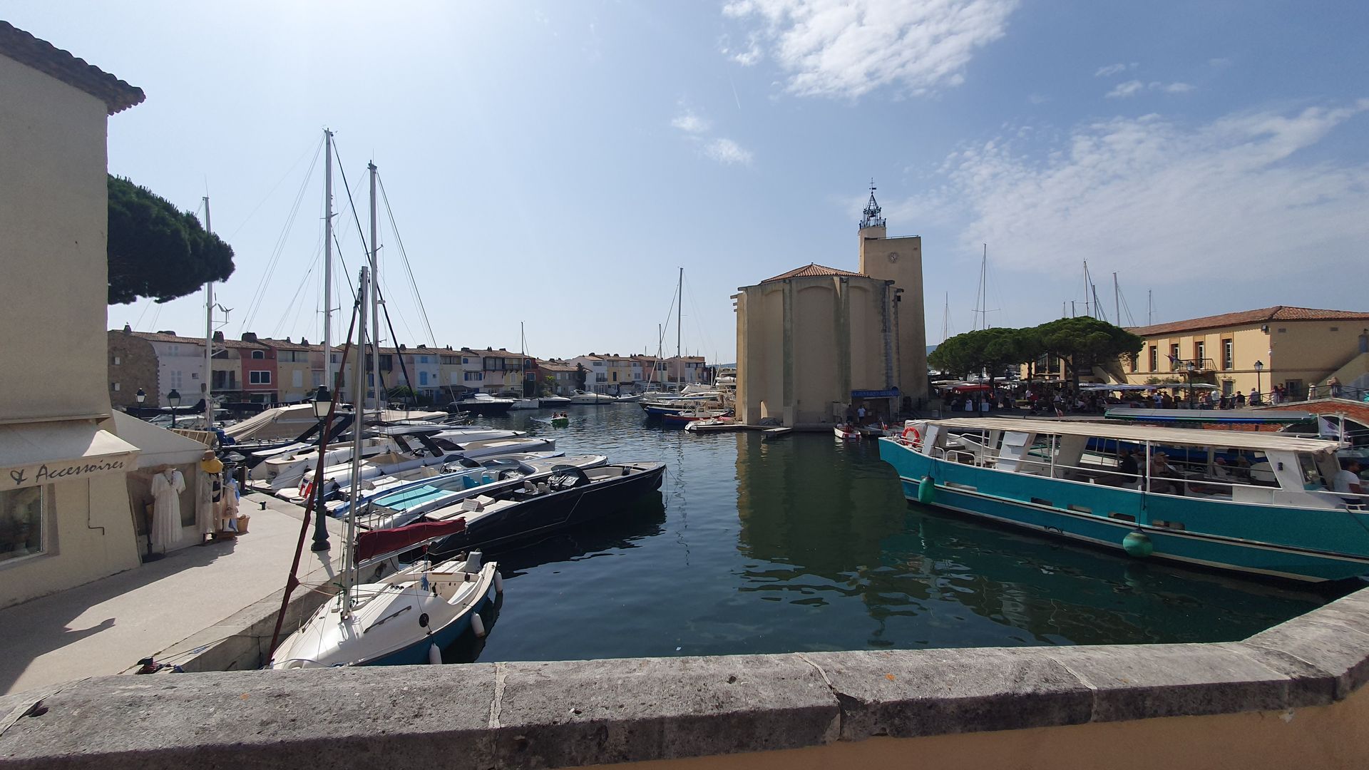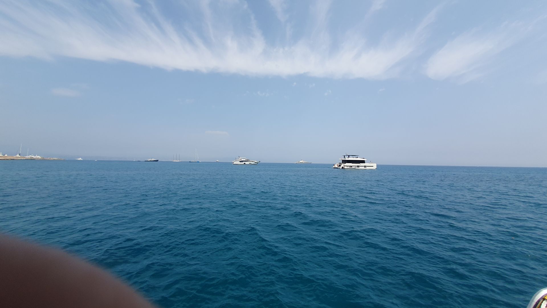 14.06.2025 bis 16.06.2025, Einfahrt in die Bucht vor Saint Tropez. Hier liegen riesige Yachten in Serie. Wir sind aber in die Bucht bis vor Port Grimand gefahren. Hier wollten wir abwettern. Da der Mistral-Wind immer noch heftig blies, bekamen auch wir Böen von 5 Bft ab, aber der Anker hielt. Nur der extreme Bootsverkehr und vor allen Dingen die Jetski, haben immer wieder für erhebliche Schwell gesorgt, so dass man tagsüber nicht zur Ruhe kommen konnte. Ein Ausflug nach Port Grimand hat sich auch gelohnt. Hier ist Frankreich. Es war dort Markt, mit vielen Spezialitäten. Würziger Käse, frische Baguette und leckeren Leberpastete, wurde mit an Bord genommen. Ferner hatten wir auch verschiedene Sorten an Tartelles (kleine herzhafte Törtchen) mitgenommen, die wir uns dann abends haben schmecken gelassen. Heftig war allerdings die Tagestemperatur von 36 Grad, der Spitzenwert lag später bei 40,6 Grad. Im kühlen Nass mussten wir uns abkühlen, Wassertemperatur 25 Grad.