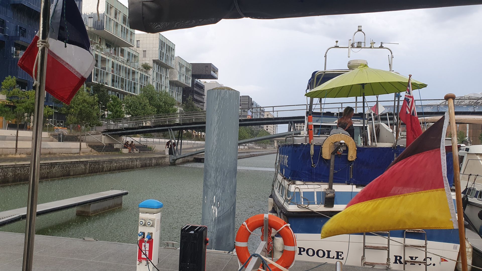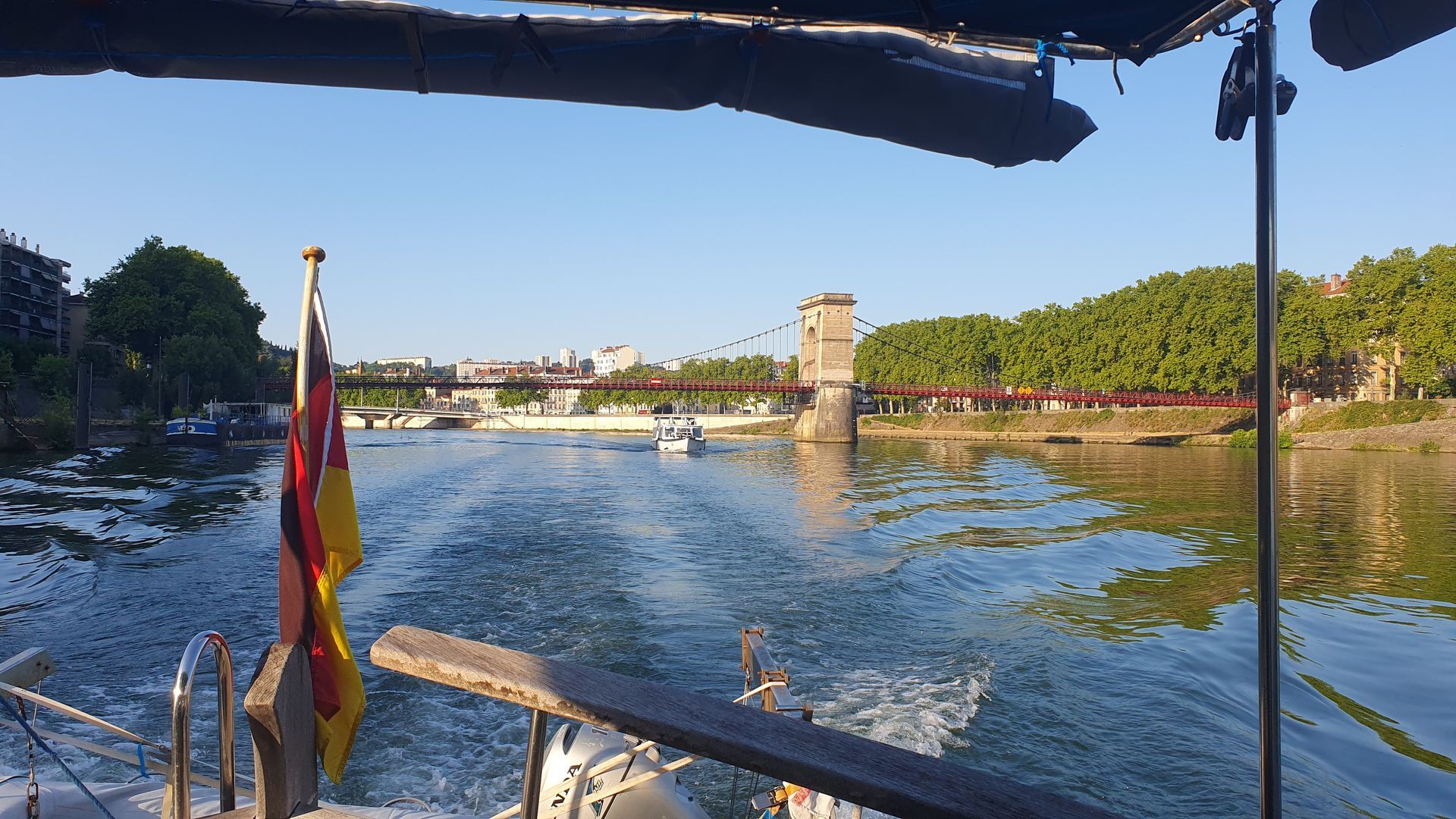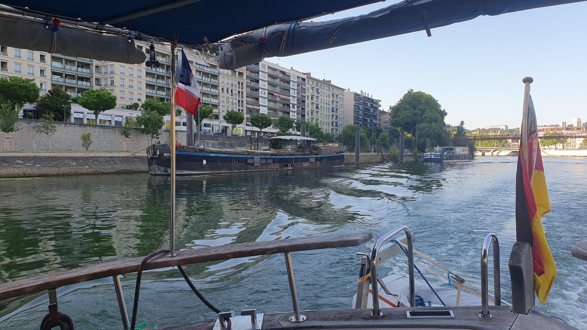 29.06.2025, Lyon. In der Ortsmitte gibt es einem engen, kleinen Hafen. Unsere Aufgabe war, unser Flaggenkreuz abzubauen und umzulegen, weil die Brücken in der Saone zu niedrig sind. Nachdem die Arbeit getan war, konnten wir das Treiben im Hafen vom Boot aus schön beobachten. Am Abend gab es ein kleines Gewitter mit einem starken Regenguss. Eine Erholung!!