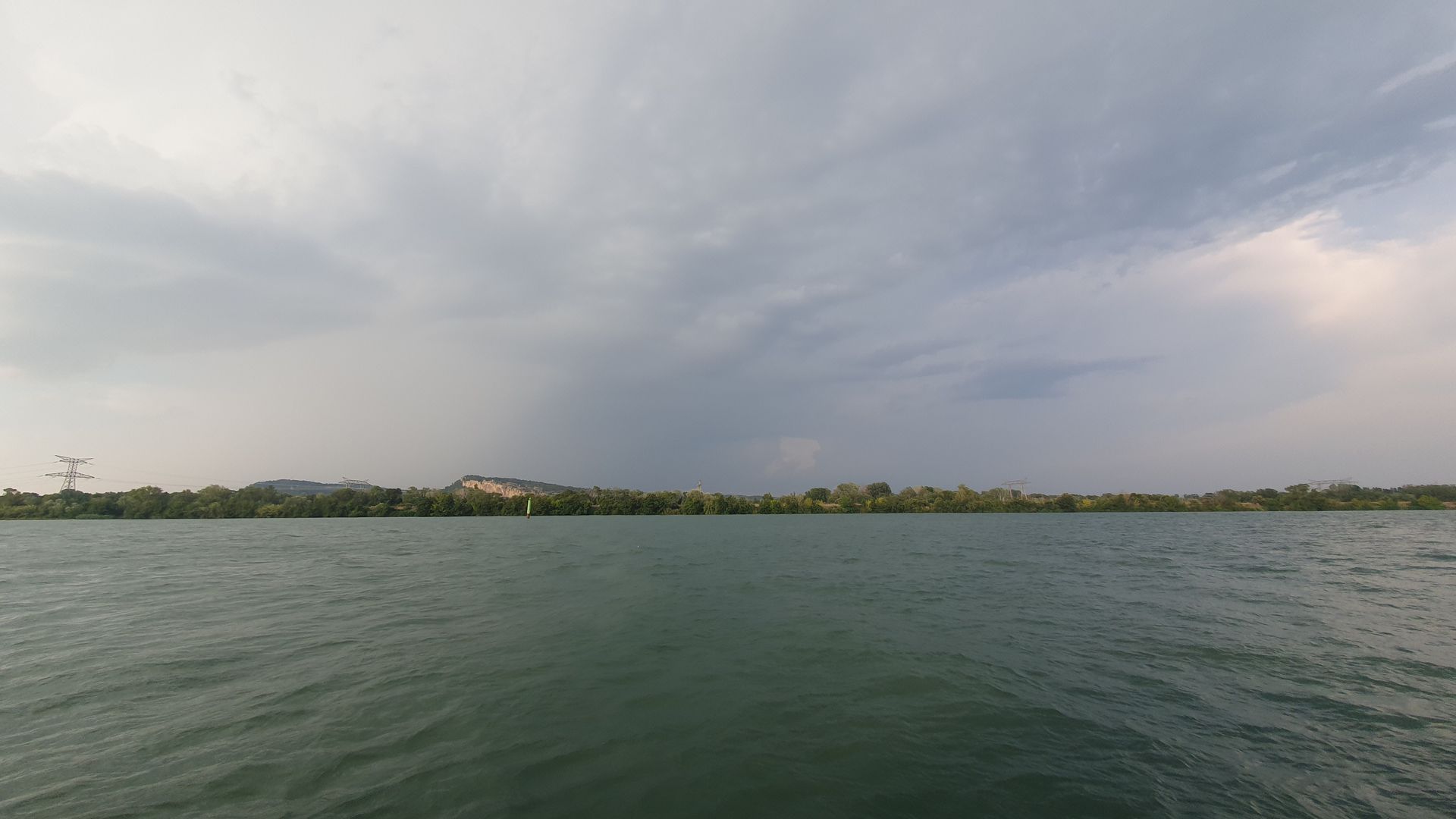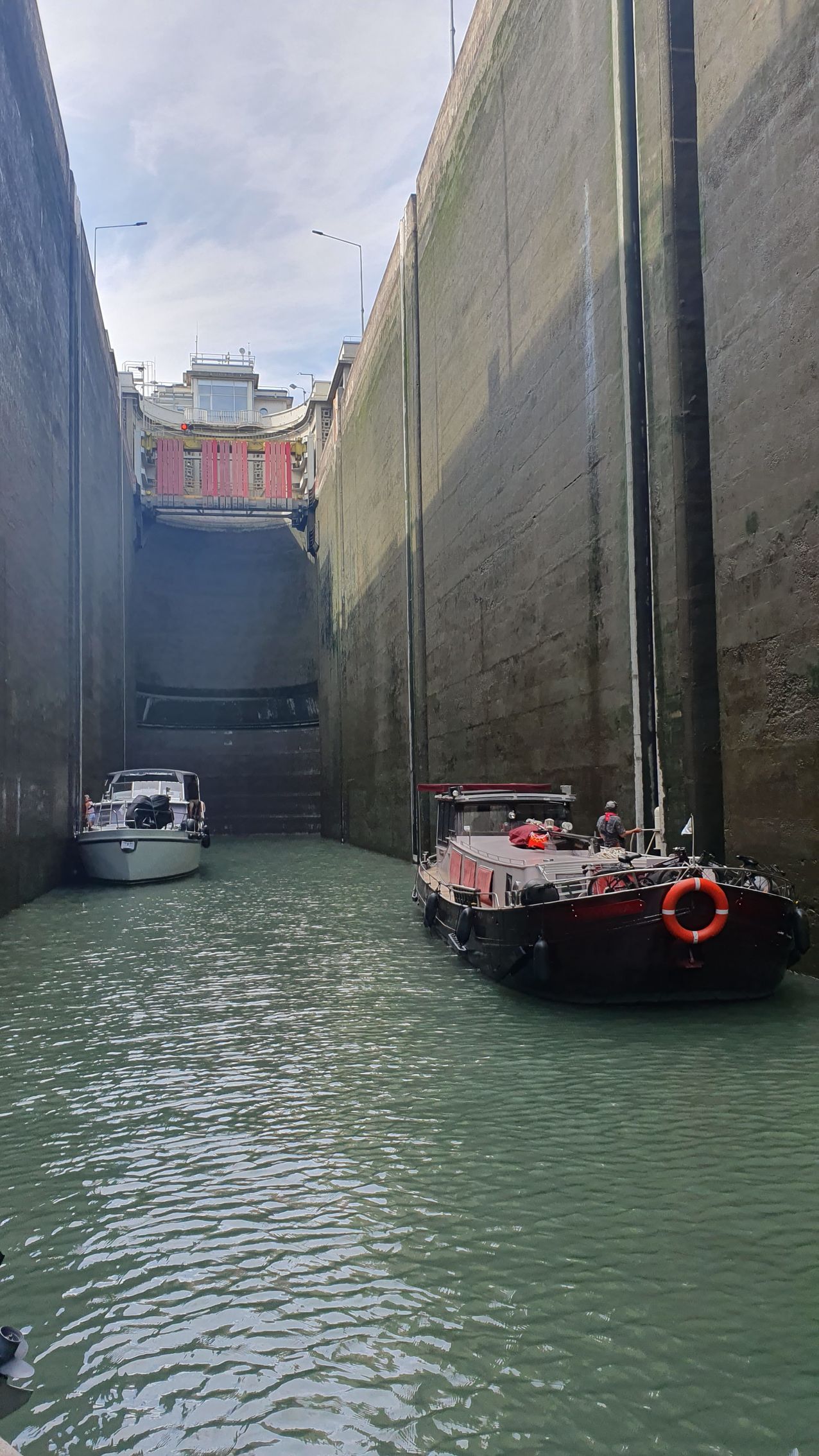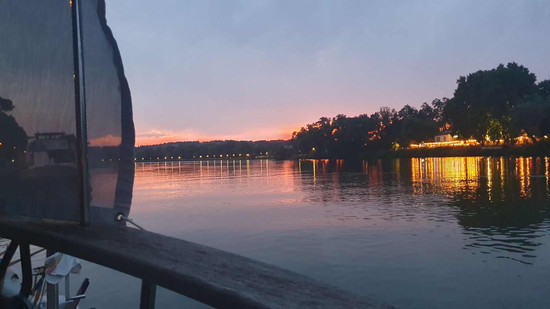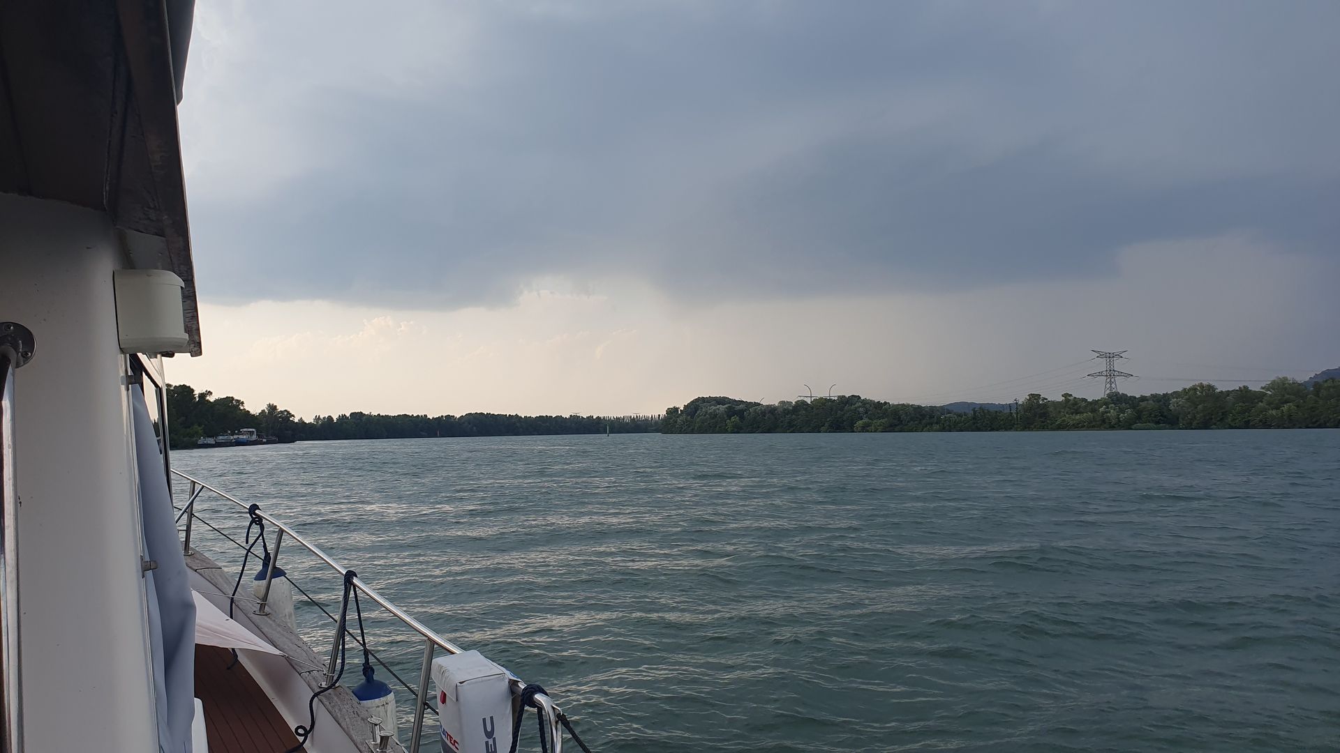 29.06.2025, Lyon. In der Ortsmitte gibt es einem engen, kleinen Hafen. Unsere Aufgabe war, unser Flaggenkreuz abzubauen und umzulegen, weil die Brücken in der Saone zu niedrig sind. Nachdem die Arbeit getan war, konnten wir das Treiben im Hafen vom Boot aus schön beobachten. Am Abend gab es ein kleines Gewitter mit einem starken Regenguss. Eine Erholung!!
