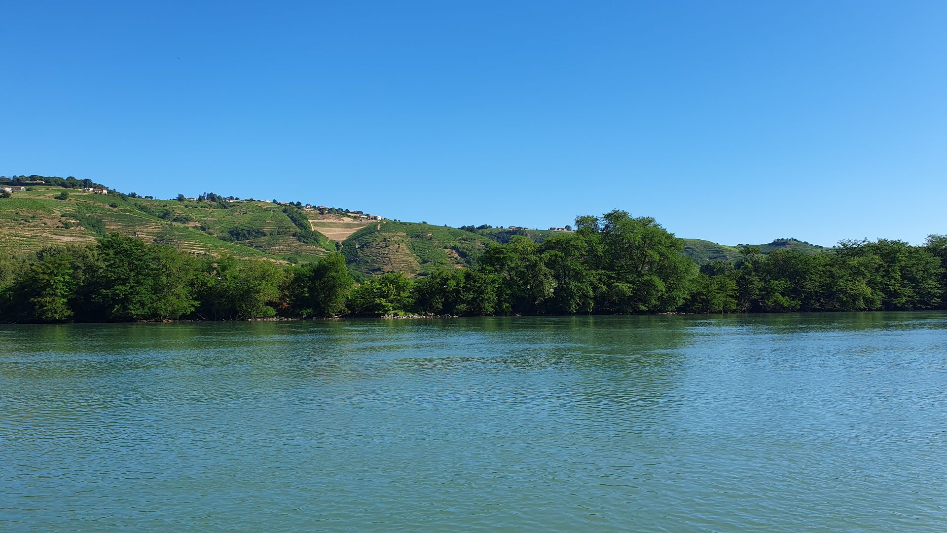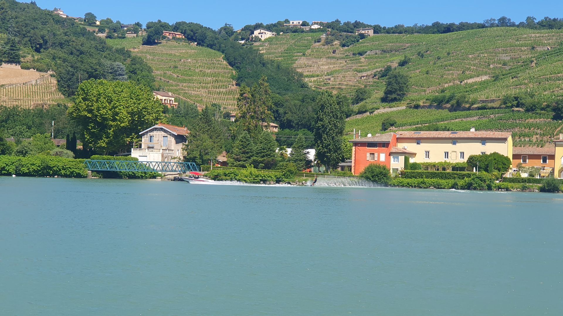 26.06.2025 bis 28.06.2025,Die Weiterfahrt ging über Valence, Saint Vallier, nach Les Roches de Condrieu. Mittlerweile haben wir Temperaturen von über 30 Grad und leider haben wir die Temperaturen auch im Schiff. Eine kleine Klimaanlage im Schlafbereich hilft, sofern wir Stromanschluss im Hafen haben. Die Anlage senkt die Temperatur dann um ca. 3 Grad. Es sollte auch noch schlimmer kommen. Die höchste Temperatur war 40,8 Grad, im Schlafraum hatten wir dann 37 Grad. Gute Nacht.